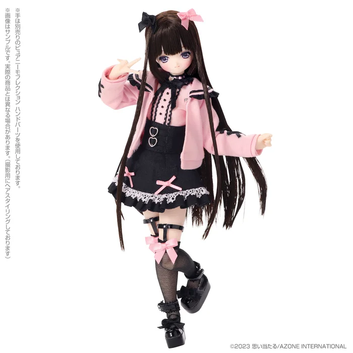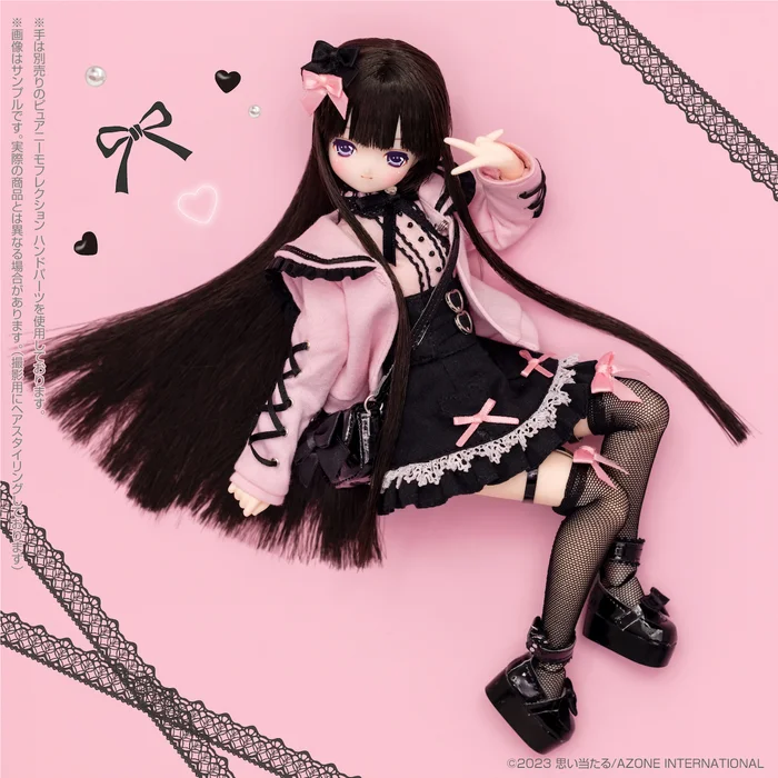 From Azone International comes the 15th series in the Ex-Cute doll line, Melty Cute, and the first cutie to be released is Sweet Baby Lien! This adorable doll features a Pure Neemo Flection S/Girl white body with captivating purple and ice blue eyes that sparkle with life and complement her straight, dark brown hair styled in a hime cut and decorated with black and light pink hair ribbons.